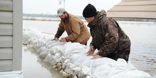 Biscoe, AR-Philip Lightsey, left, and his son Josh, check the water levels around the sandbags which encompass his house. The sandbags are helping to form a protective barrier so that the water level does not rise and get inside of the house.